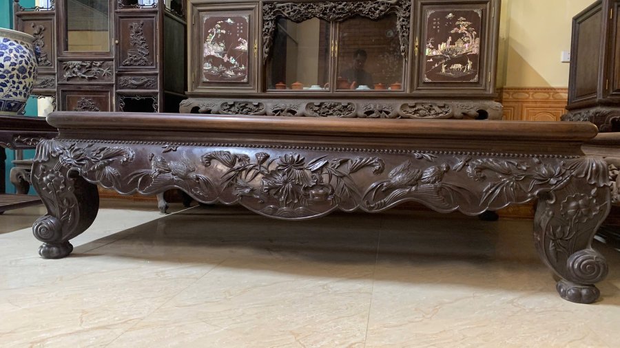 Sập sen vịt gỗ gụ cổ liền mặt 2 lá đục chạm tay sắc nét