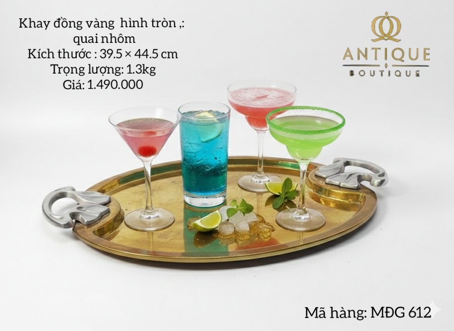 Khay đồng hình tròn màu như vàng, dày cầm nặng tay.