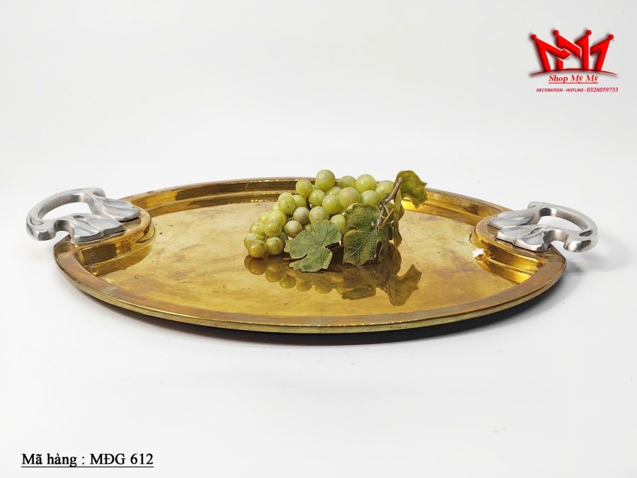 Chiếc khay phục vụ hình bầu dục bằng đồng.