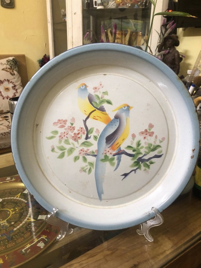 Khay sắt tráng men đôi chim trên cành hoa đào chuẩn xưa bao cấp. * Tình trạng: Hiếm, tì