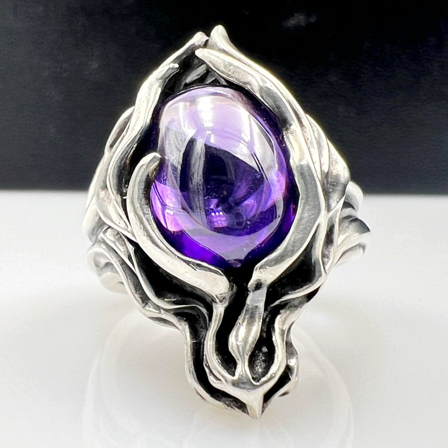 Nhẫn rồng bạc 925 hiệu bizarre phôm bự hoa văn sắc nét đính đá thạch anh tím rất đẹp, size