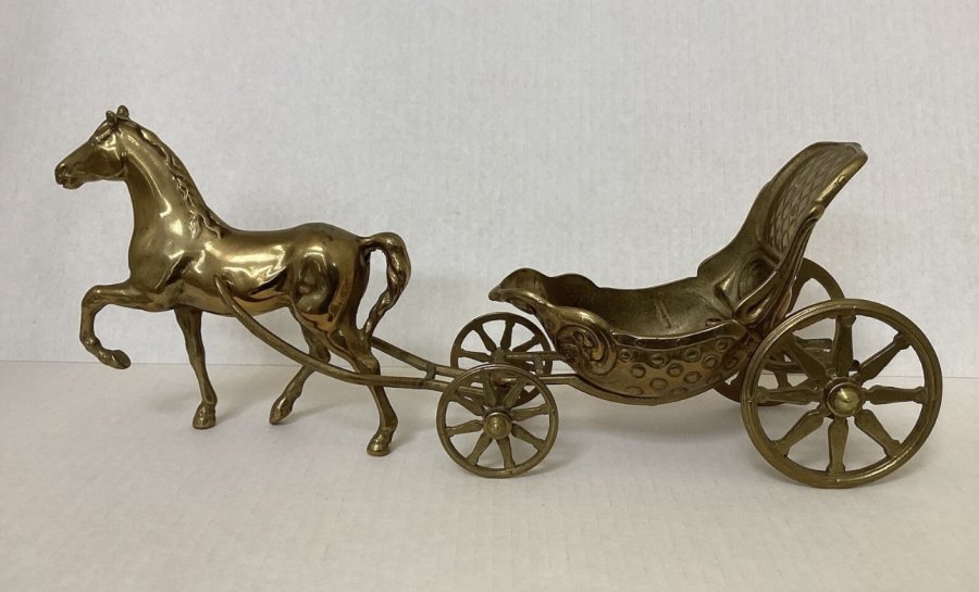 70s Ngựa đồng kéo xe tinh xảo made Italy đồng vàng trang trí.