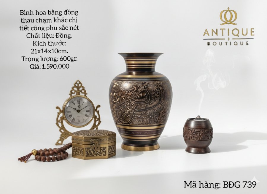 Bình hoa bằng đồng thau chạm khắc công phu