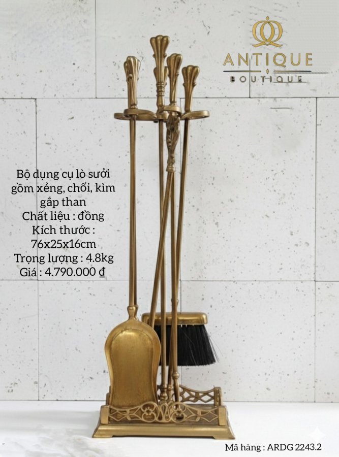 Vật dụng lò sưởi gồm xẻng, chổi, kìm gắp than, que chọc lửa