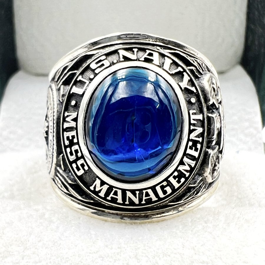 Nhẫn bạc U.S Navy Mess Management phôm xưa hoa văn sắc nét đá xanh mo rất đẹp, còn keo lót
