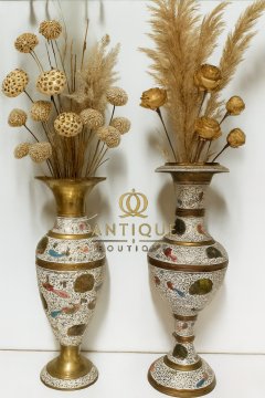 Đôi bình bằng đồng nền vẽ men trắng với những con Công màu tươi sáng rất đặc biệt