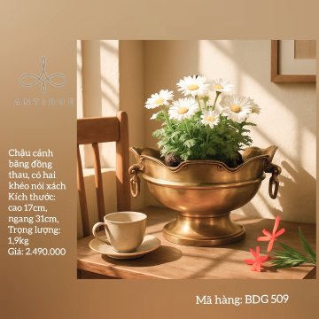 Chậu bằng đồng miệng uốn lượn với hai quai khoen tròn. Chậu trưng hoa