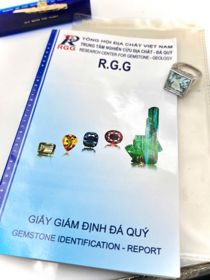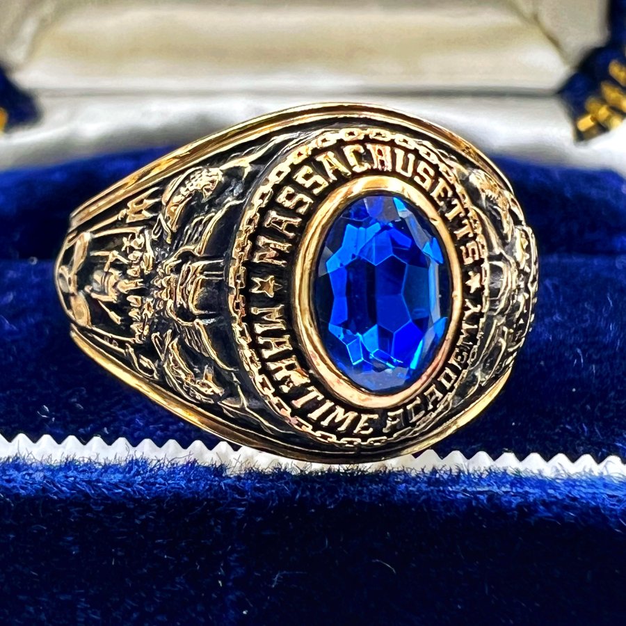 Nhẫn vàng 10k học viện hàng hải Massachusetts (MMA) năm 1985 hoa văn sắc nét đá xanh đa gi