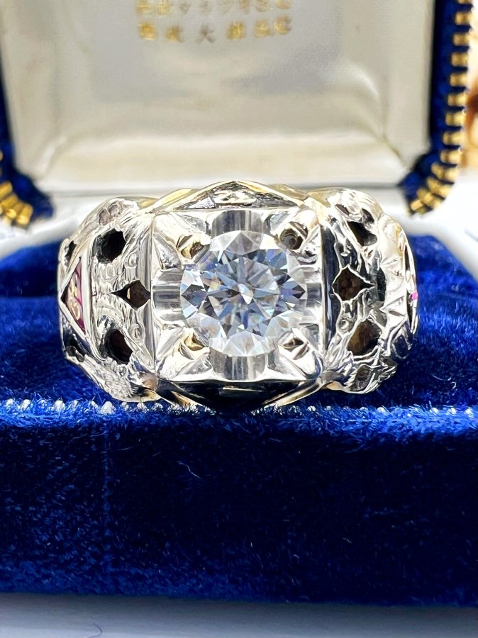Nhẫn vàng 10k đemi 2 màu hội tam điểm Masonic hoa văn sắc nét đính soàn moisanite 6.3li rự