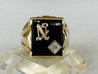 Kính phố vàng 10k. Hột đen bòng logo có chữ N và gắn viên xoàn thiên nhiên 1ly5. SIze:18.