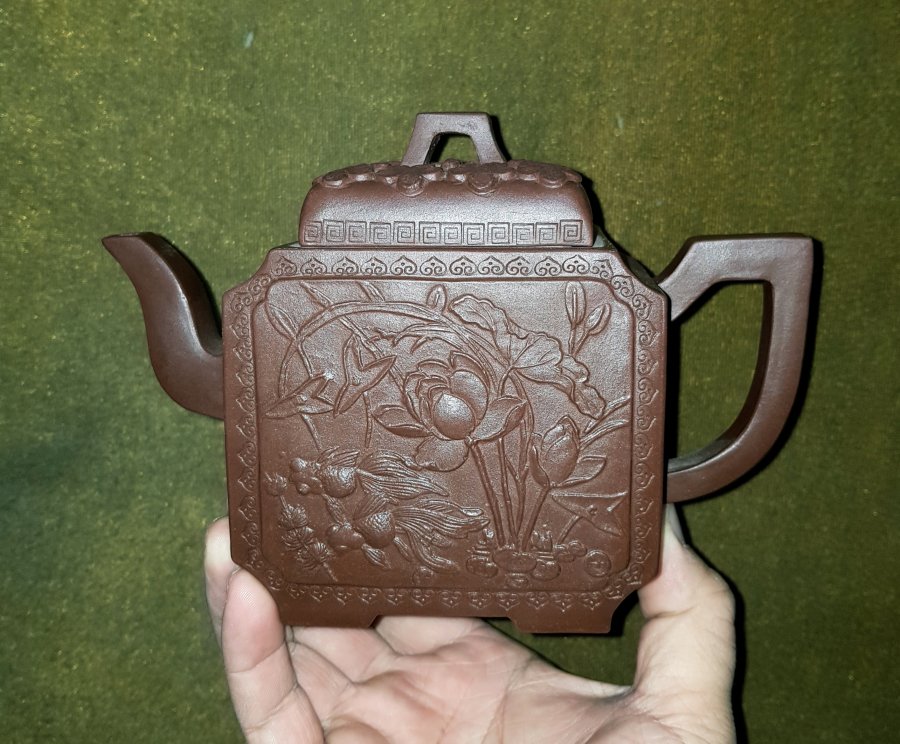 Ấm tử sa dáng vuông đắp nổi sen ngư GL2550k