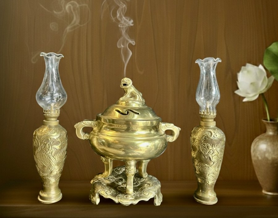 Đ11- Bộ đỉnh trầm và đèn dầu bằng đồng catut cao 30cm