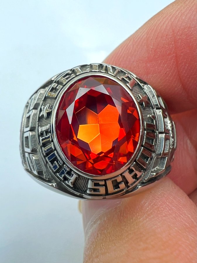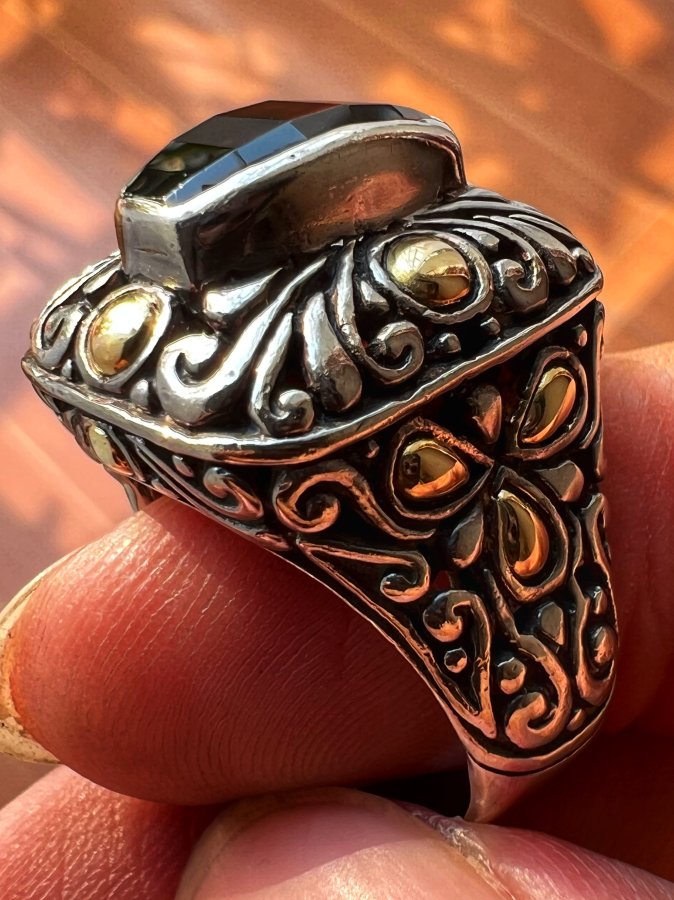 Nhẫn hợp kim A Long năm 2002 mới tinh hoa văn sắc nét đá xanh cam đa giác rất đẹp, size 21