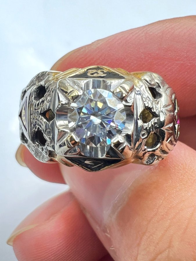 Nhẫn vàng 10k đemi 2 màu hội tam điểm Masonic hoa văn sắc nét đính soàn moisanite 6.3li rự