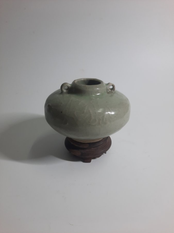 Thủy trì men ngọc ám họa loại to, dáng bánh dày hai quai độc đáo