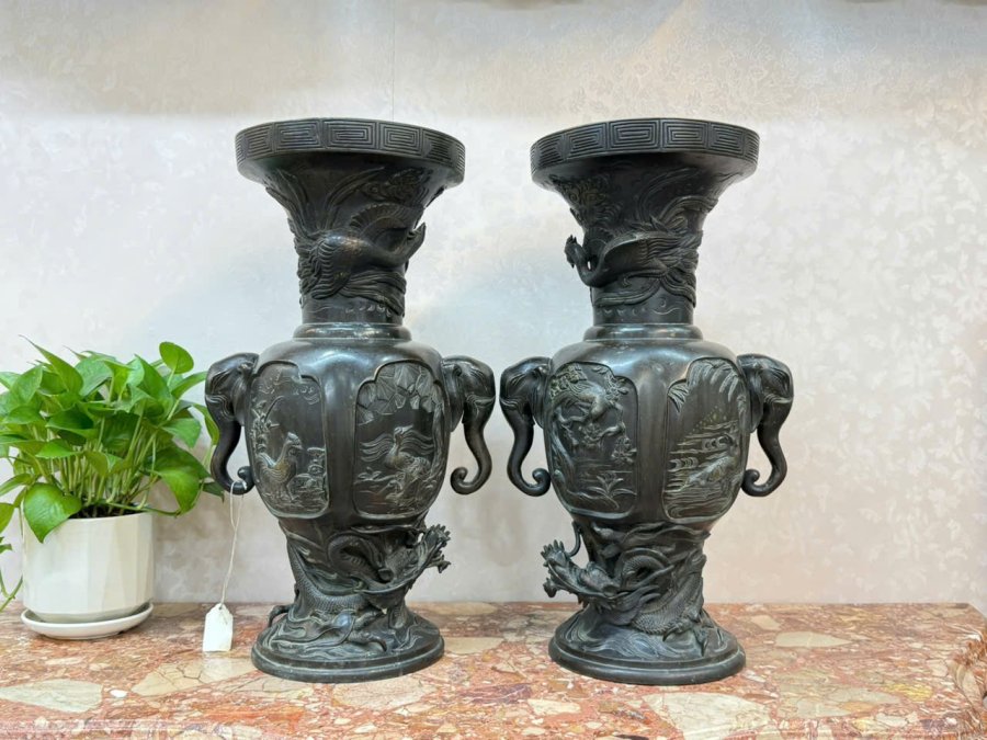 Cặp bình đồng Nhật Bản “ Chim Phượng Hoàng và Rồng có quai cầm Đầu Voi