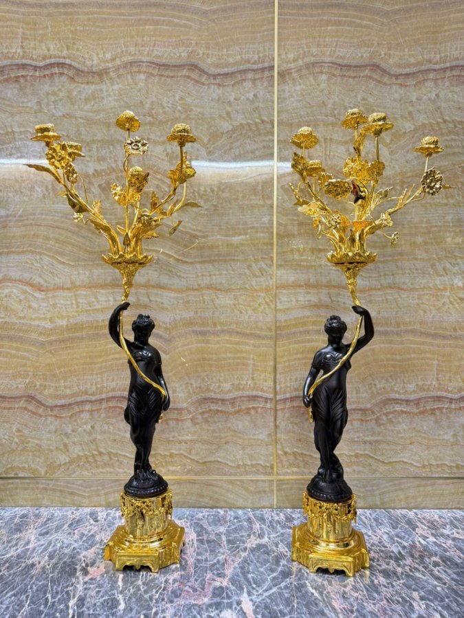 Cặp chân nến tượng đồng lắc kê vàng Châu Âu