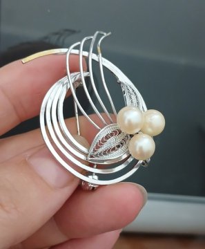 Cài áo Nhật lắc kê bạc, đính 3 viên ngọc trai Akoya 7ly bóng đẹp