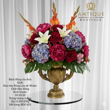 Bình đồng họa tiết Rồng Lửa xứ Wales miệng hoa hồng Tudor biểu tượng Anh Quốc