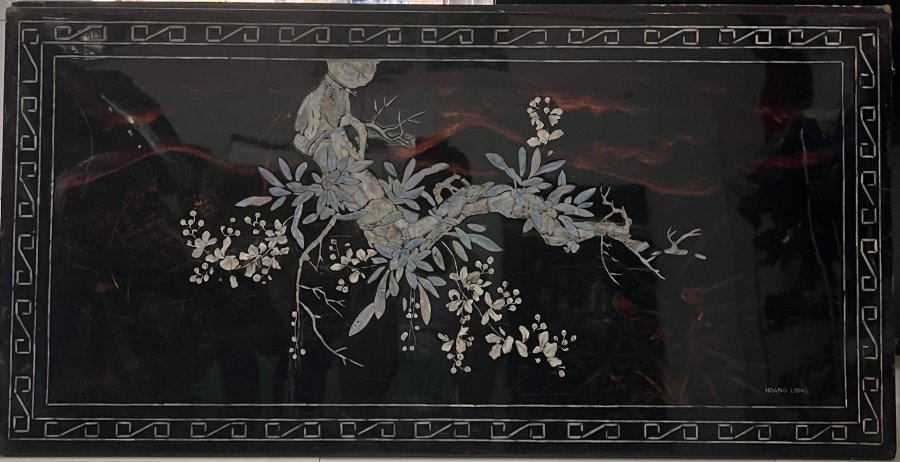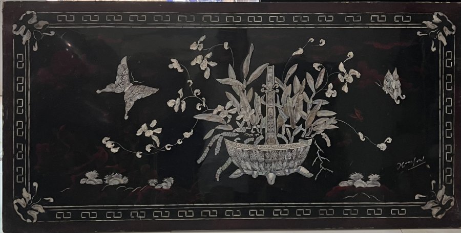 Tĩnh vật Sơn mài cẩn ốc xưa Có hiệu lò Kt 60cm x 1m20 Giá 1800k