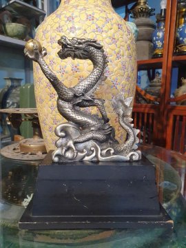 Tượng rồng được chế tác tinh xảo làm từ hợp kim mạ bạc.Cao cả đế 26cm*rồng cao 18cm*13cm