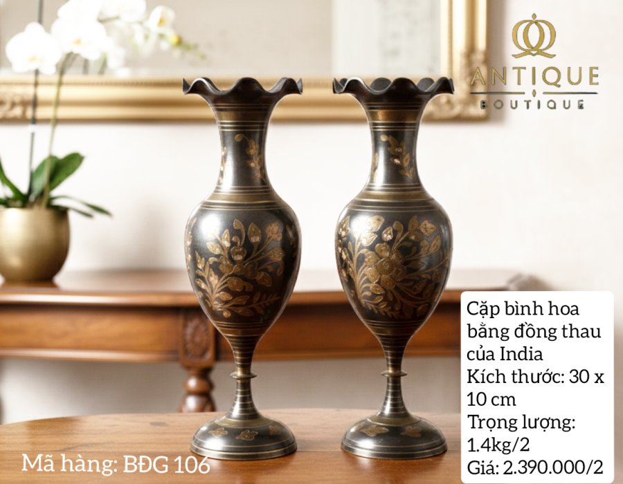 Bình hoa đồng khắc hoa lá, miệng gợn sóng.