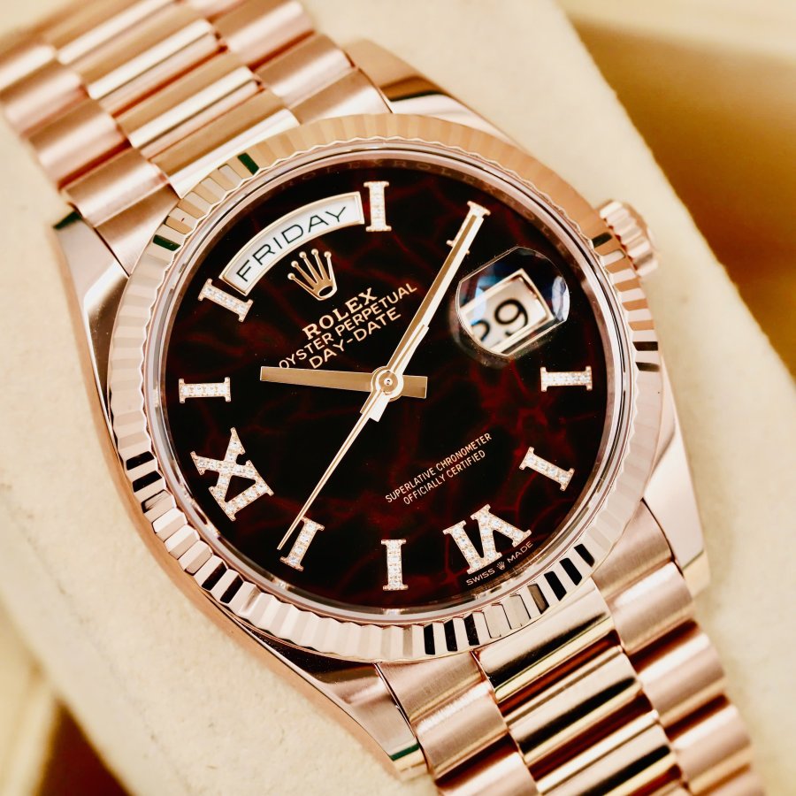 Rolex Day Date 128235 Thạch Anh Tím Diamonds Roman, Vàng hồng đúc 18k nguyên khối