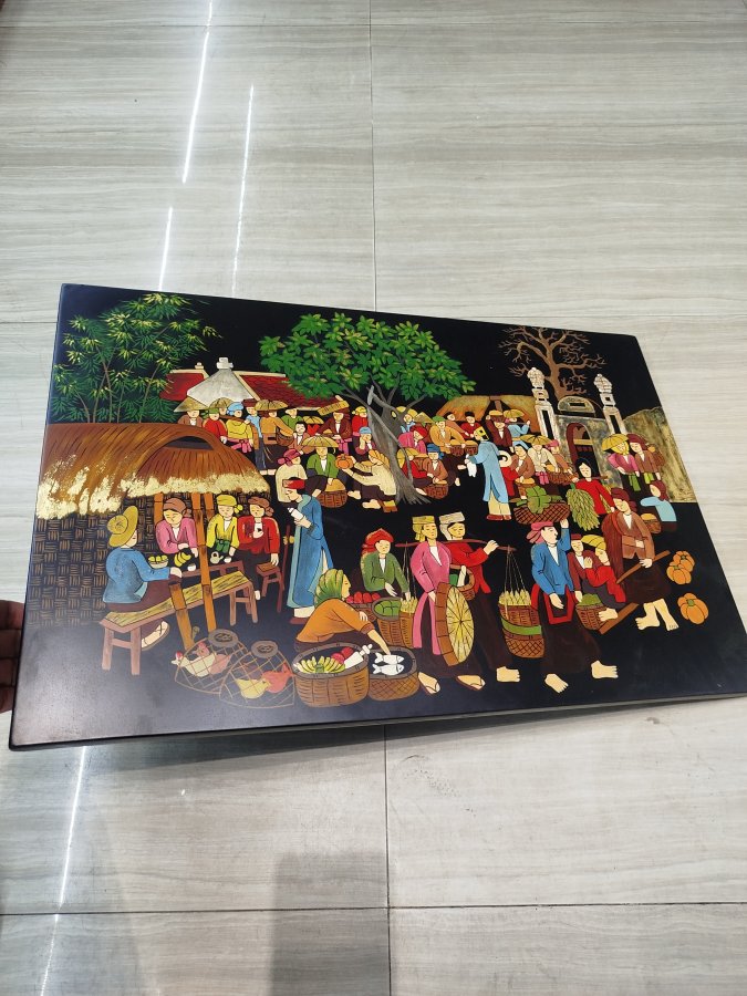 Giao lưu bức tranh gỗ sơn mài cảnh chợ quê đt 0983491274