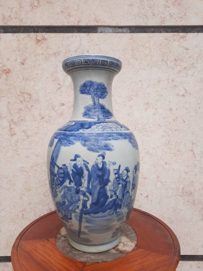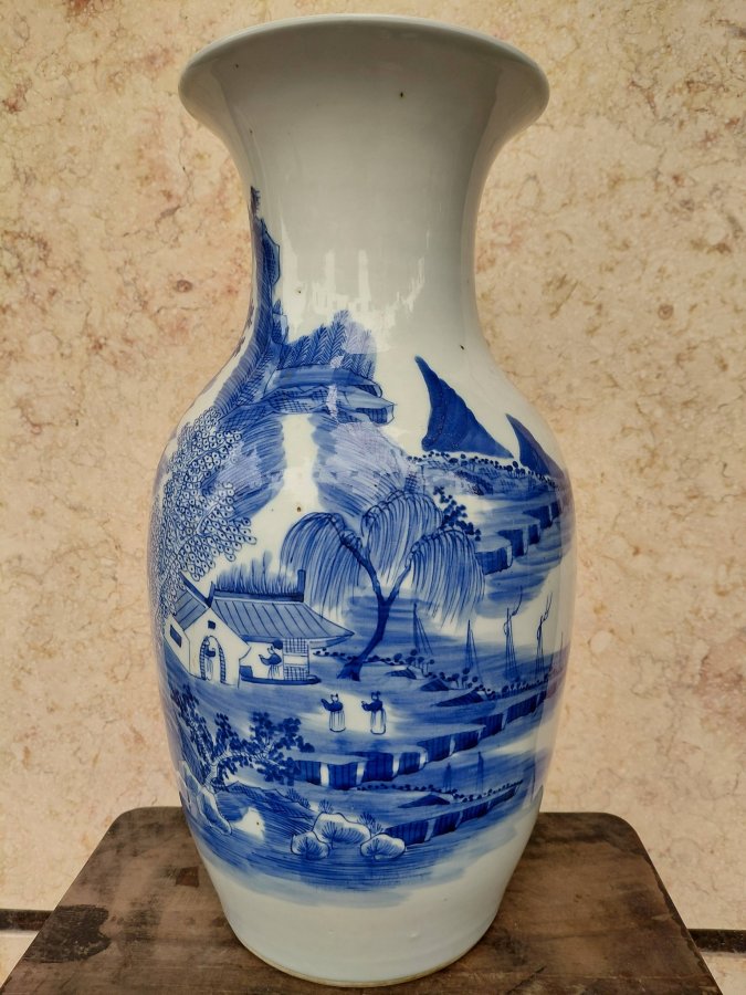 Lọ gốm sứ Tàu xanh trắng họa tiết " Sơn Thủy Hữu Tình" cao 43.5cm