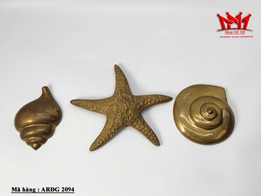 Bộ 3 vỏ óc và sao biển dùng để trang trí treo tường được làm bằng đồng.