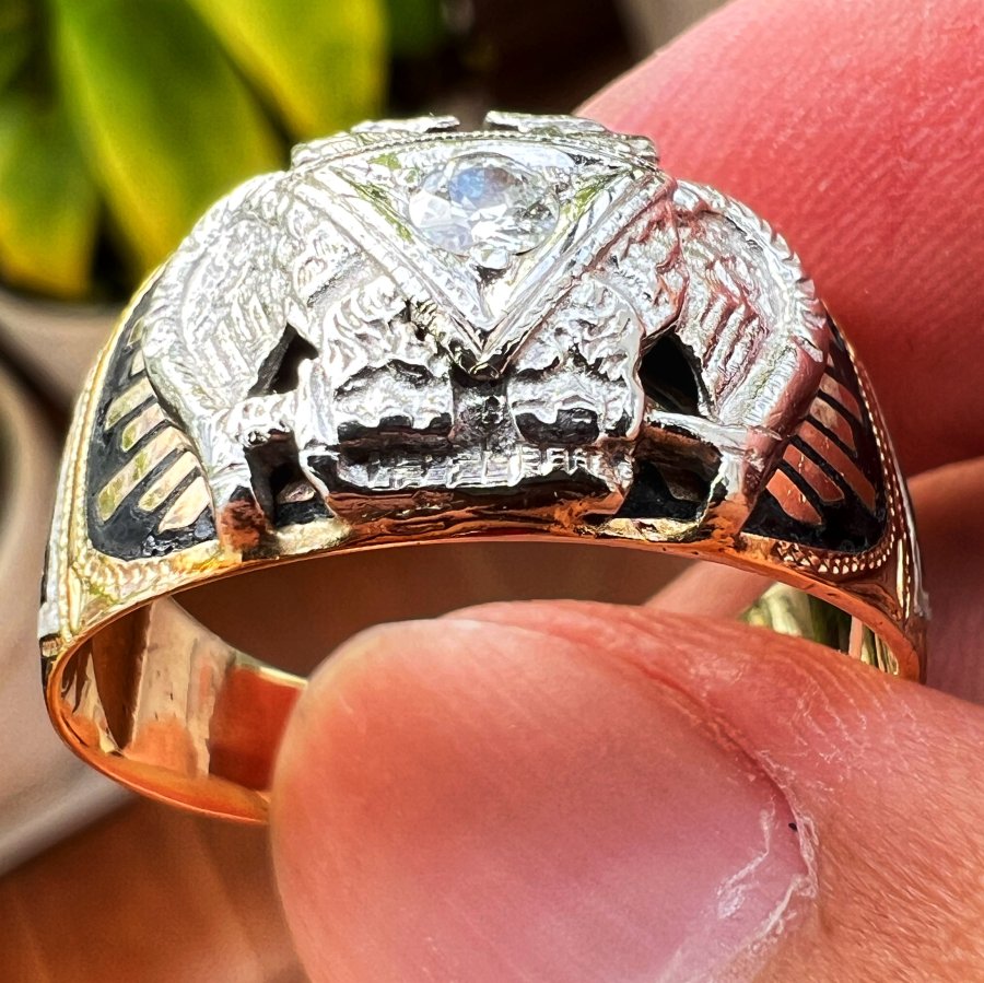Nhẫn vàng 14k hội tam điểm Masonic đính soàn thiên nhiên 3.2li rất đẹp, size 20.5mm, nặng