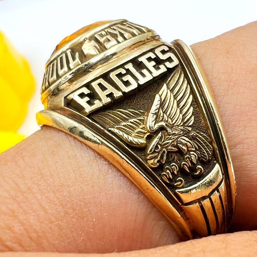 Nhẫn vàng 10k trường Keystone Oaks năm 1976 Phôm bự hoa văn sắc nét đá vàng hổ phách đa gi