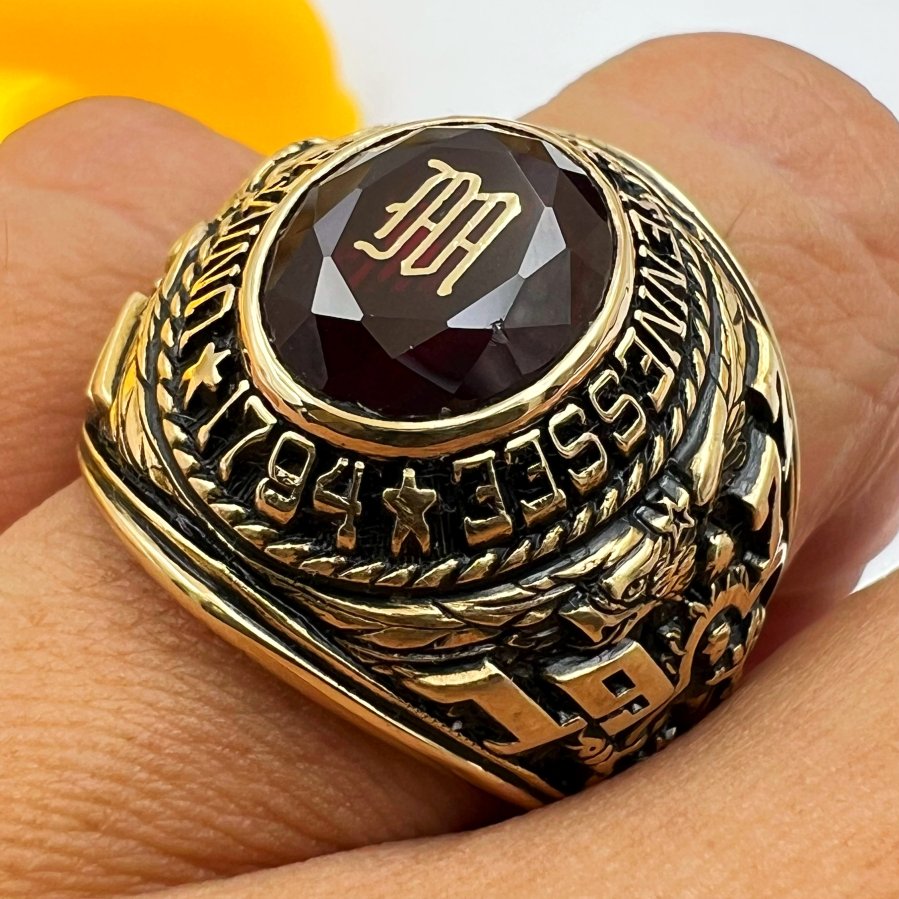 Nhẫn vàng 10k trường ********** tennessee năm 1977 Phôm bự hoa văn sắc nét đá đỏ đa giác khảm