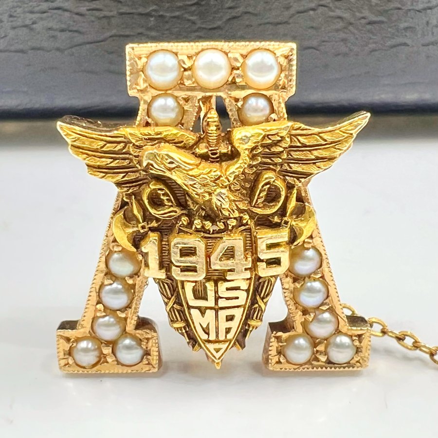 Huy hiệu (Pin) vàng 14k USMA (West Point) năm 1945 Mới cứng hoa văn sắc nét đính ngọc trai
