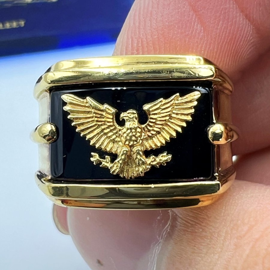 Nhẫn bạc 925 USA lake vàng hiệu FM hoa văn sắc nét đá đen ốp logo đại bàng vàng 18k rất đẹ