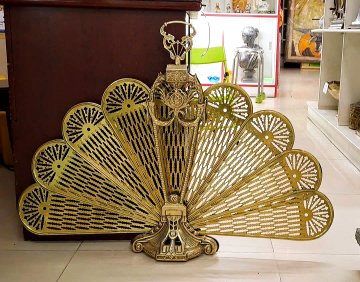 Tấm chắn lò sưởi cũ của Pháp 1980 . Tấm chắn tia lửa. Đầu hình con công bằng đồng