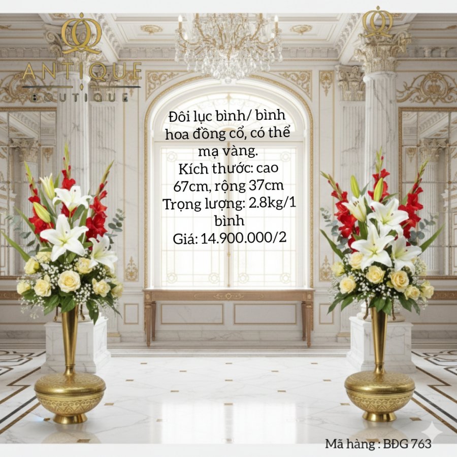 Đôi lục bình/ bình hoa bằng đồng cổ, cao 67 cm có thể là... mạ vàng