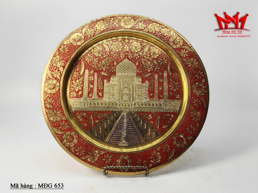 Đĩa đồng thau nguyên khối thủ công Hình ảnh hoa và Taj Mahal ở giữa
