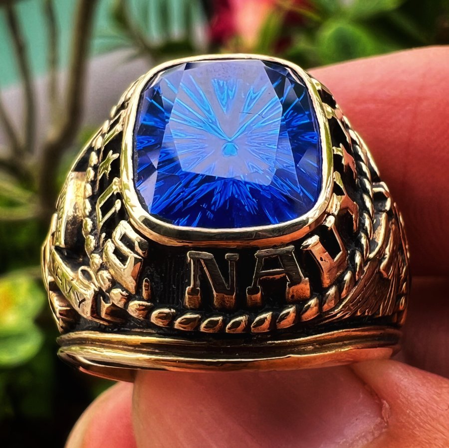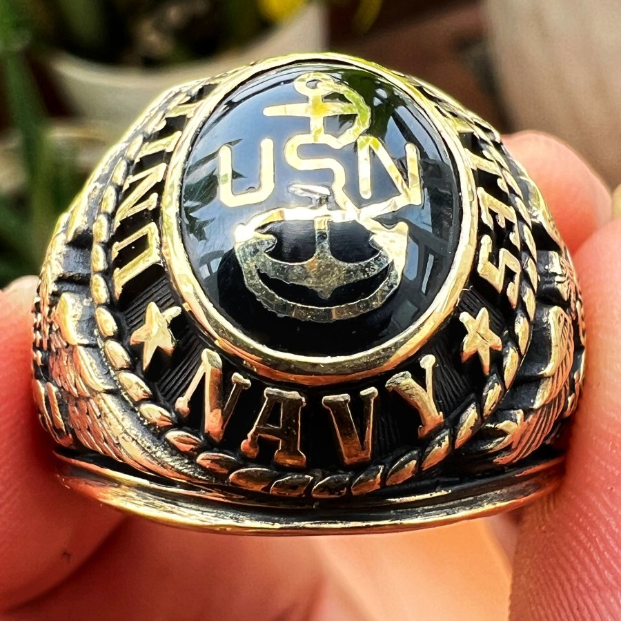 Nhẫn vàng 10k U.S Navy năm 1985 phôm bự hoa văn sắc nét đá đen khảm logo vàng rất đẹp, siz