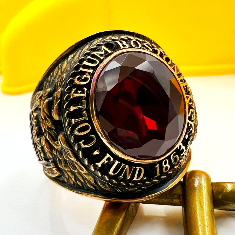 Nhẫn vàng 10k trường ********** Boston năm 1970 mới cứng phôm bự hoa văn sắc nét đá đỏ đa giá