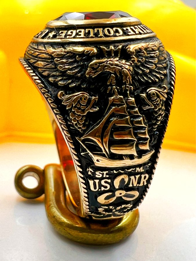 Nhẫn vàng 10k học viện hàng hải New York năm 1953 phôm bự hoa văn sắc nét đá đỏ đa giác rấ