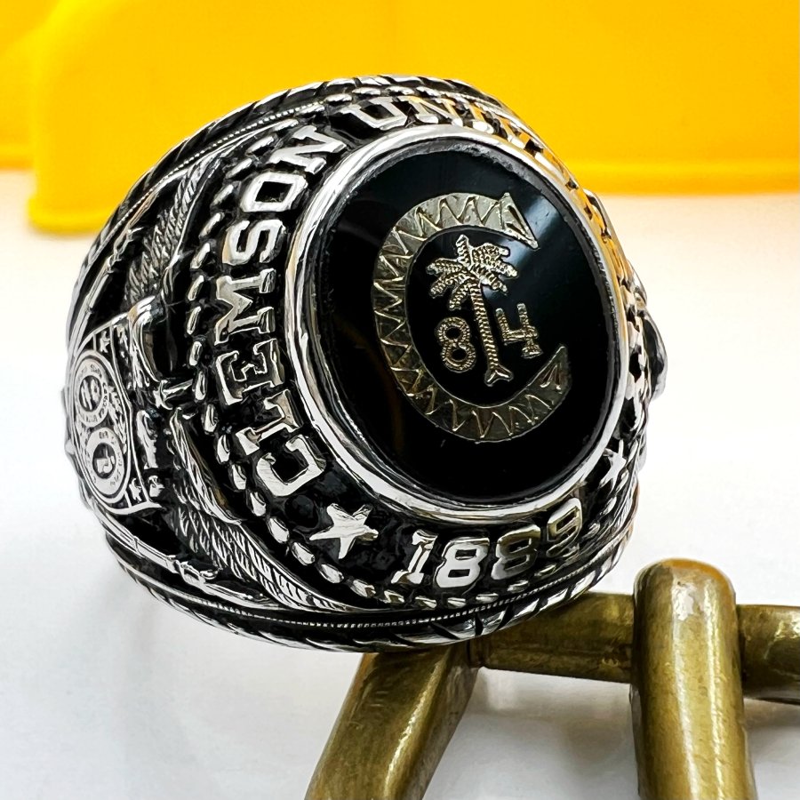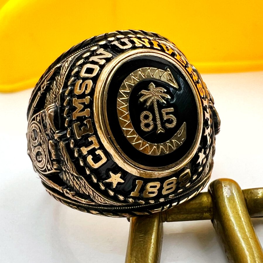 Nhẫn hợp kim trường ********** Clemson năm 1984 phôm bự hoa văn sắc nét đá đen khảm logo vàng