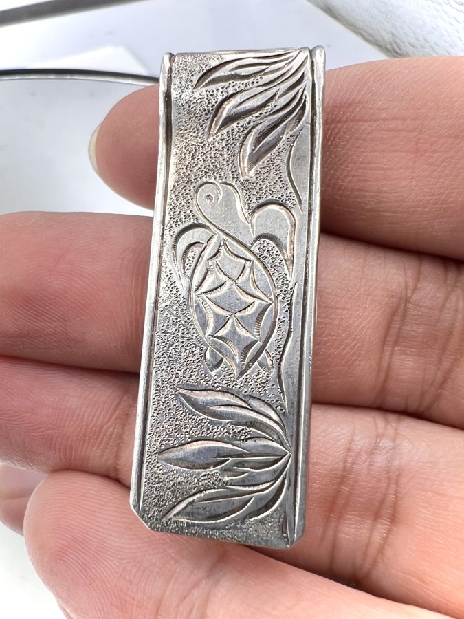 Kẹp tiền cụ rùa bạc 925 Nhật hiệu PCU hoa văn khắc thủ công sắc nét rất đẹp, size 16x46mm,