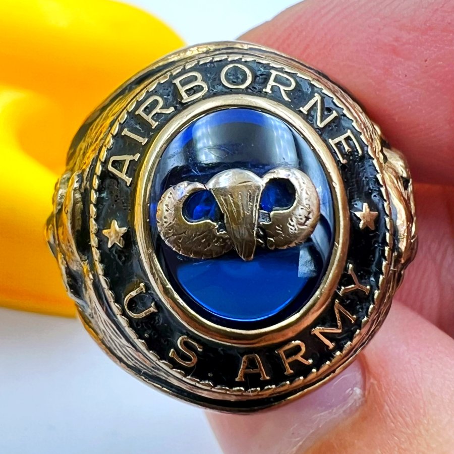 Nhẫn vàng 10k U.S Army - Airborne phôm xưa đá xanh mo khảm logo rất đẹp, size 18.5mm - nga