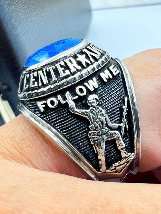 Nhẫn hợp kim U.S Army Infantry Center phôm bự hoa văn sắc nét đá xanh tia đa giác rất đẹp,