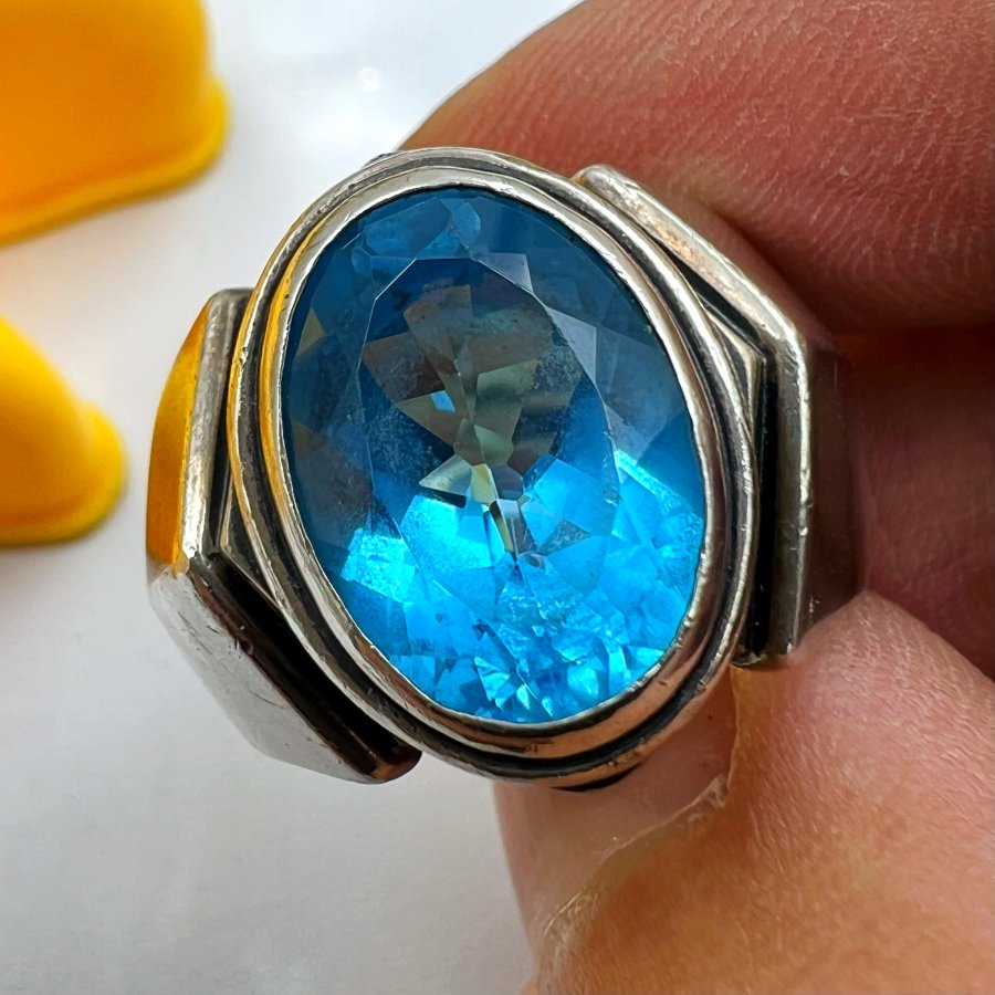 Nhẫn bạc 925 hiệu Ms Collection phôm bự hoa văn sắc nét đính đá topaz xanh đa giác rất đẹp