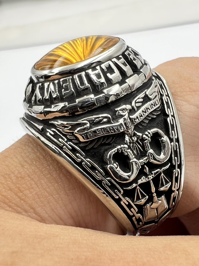Nhẫn hợp kim học viện cảnh sát năm 1975 phôm bự hoa văn sắc nét đá vàng hổ phách tia mắt m