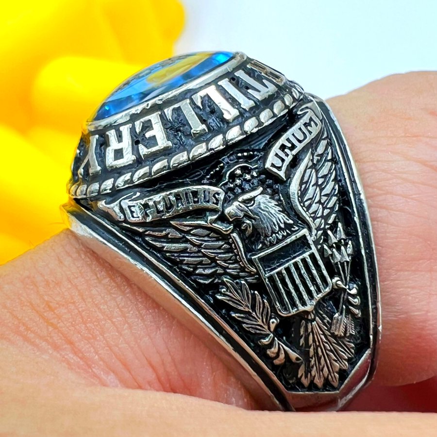 Nhẫn hợp kim U.S Army Artillery phôm bự hoa văn sắc nét đá xanh mo có logo rất đẹp, size 1