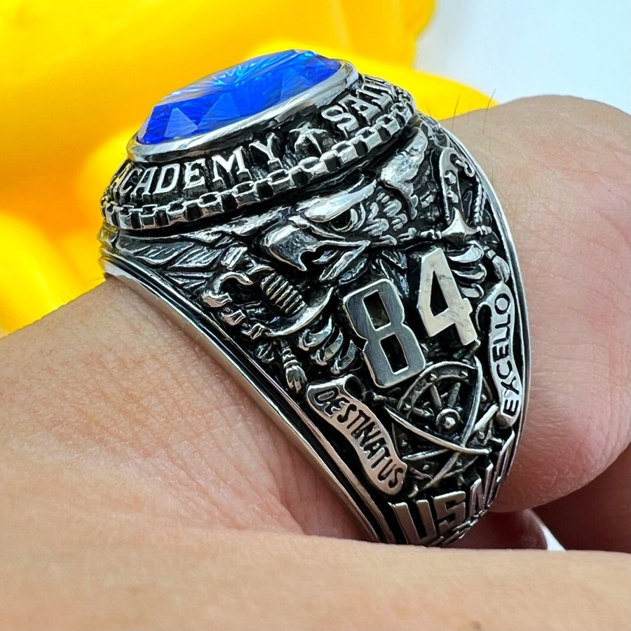 Nhẫn hợp kim U.S Naval Academy năm 1984 mới cứng phôm bự hoa văn sắc nét đá xanh tia đa gi