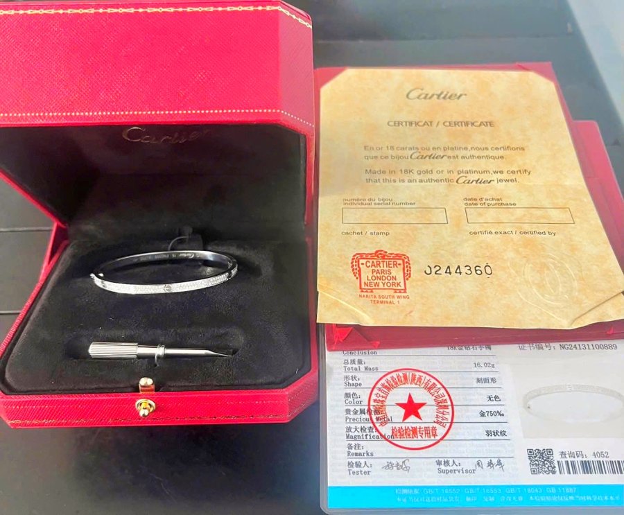 Về đội vòng Cartier HK vàng trắng 18k mới tinh đính full soàn thiên nhiên rất đẹp, fullbox